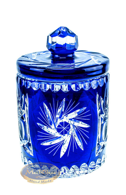 Ekskluzywna kobaltowa kryształowa bomboniera o wyjątkowym designie. Pięknie ręcznie szlifowana i malowana, ta misa kryształowa wysokiej jakości jest prawdziwym dziełem sztuki. Jej imponujące wymiary to 20 cm wysokości i 12 cm szerokości, co sprawia, że stanowi doskonałą dekorację i jest idealna do przechowywania pysznych smakołyków. Wzór młynek oliwka nadaje jej niepowtarzalny urok i sprawia, że będzie wyróżniać się na każdym stole. Wspaniała jakość kryształu oraz intensywny kobaltowy kolor sprawią, że ta bomboniera będzie doskonałym dodatkiem do Twojego wnętrza, a także znakomitym prezentem dla bliskiej osoby. Zaproś luksus i elegancję do swojego domu dzięki tej wysokiej jakości, handicraftowej bombonierze.